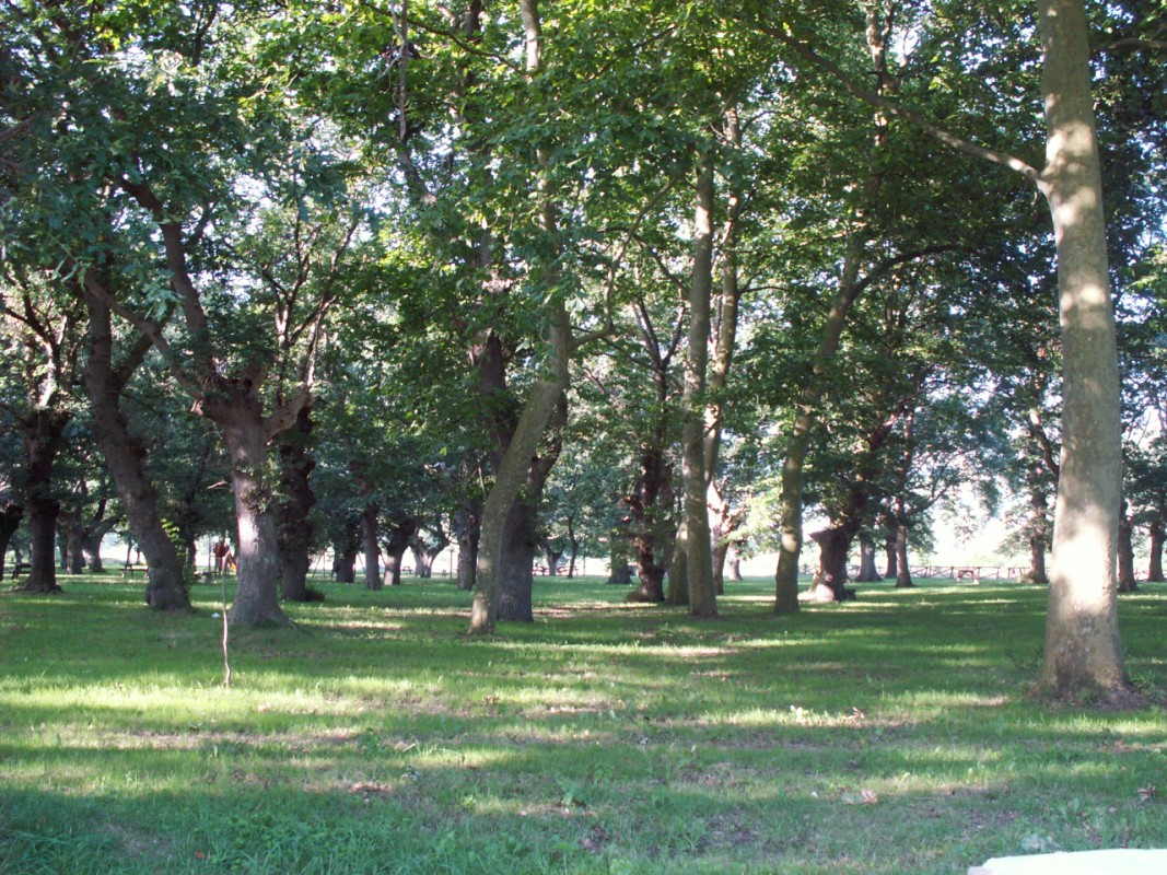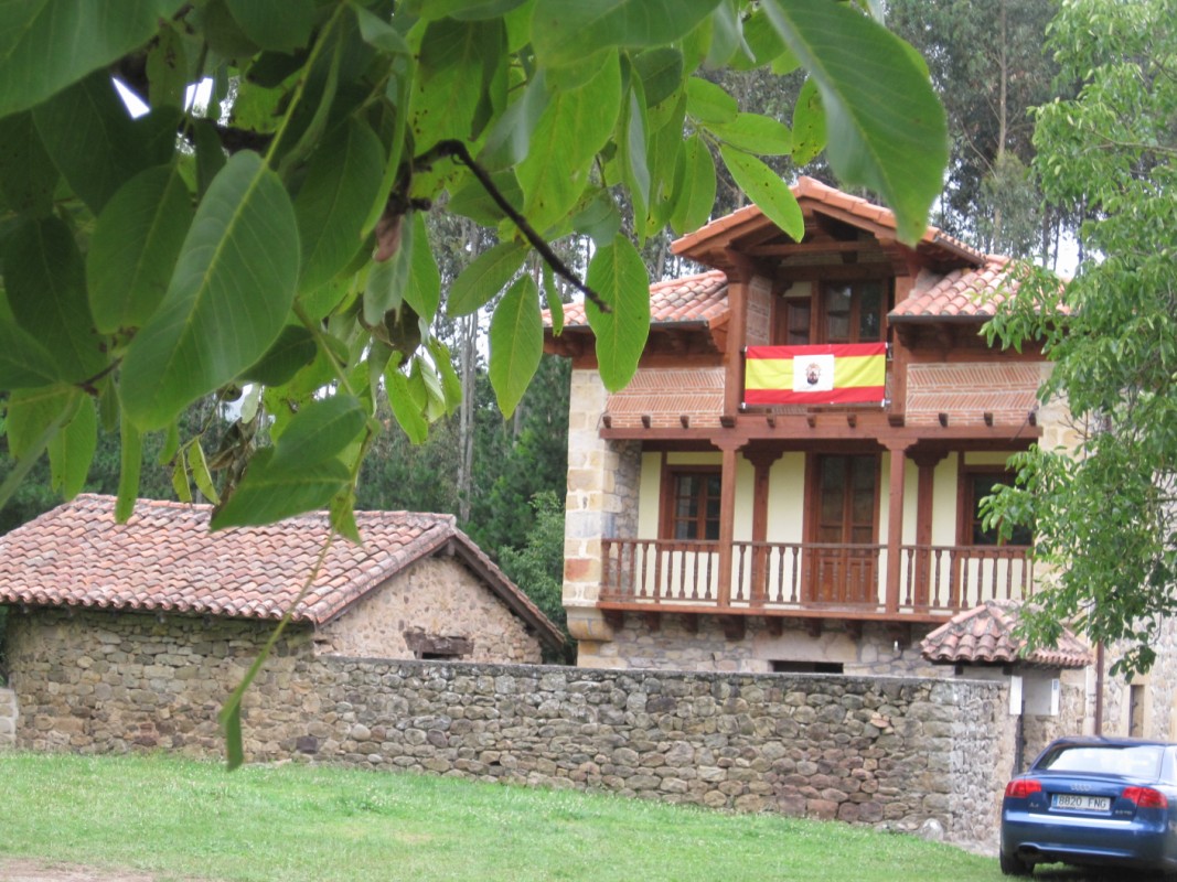 Una vista del parque que rodea la ermita del Carmen. Los árboles son robles, nosotros los llamamos cagigas y son centenarios. Ahora hay bastantes dañados, atacados por un escarabajo que pone sus larvas en ellos y construye unas galerías por debajo de la corteza. También podemos ver una casa en las cercanías, engalanada con la bandera española, como el resto de las casas del pueblo de San Martín.