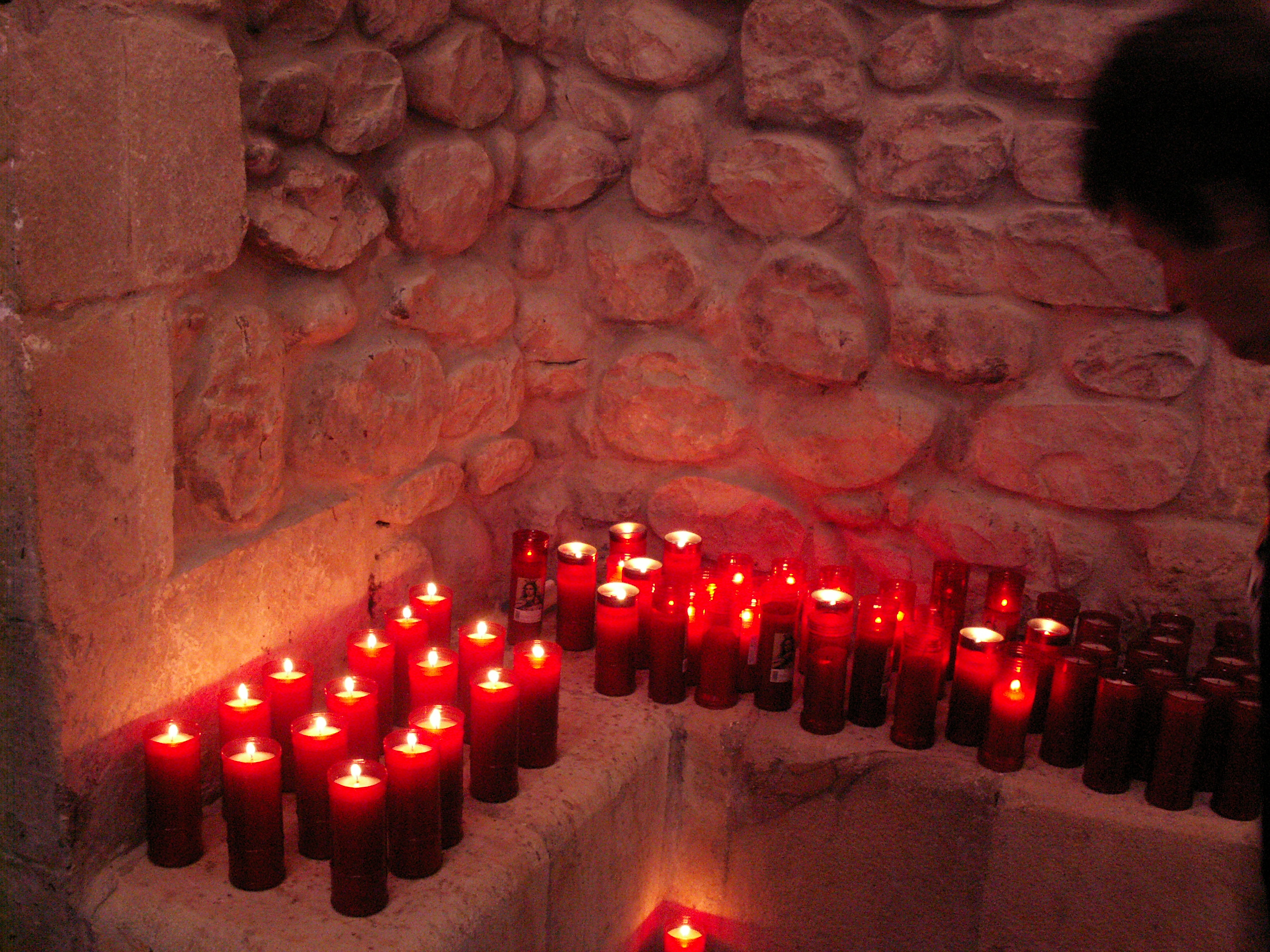 Mucha gente ha llegado antes que nosotros y ponen velas en este rincón. Las que véis en la foto son las de la mañana temprano, porque las de ayer, después de alumbrar a la Virgen toda la noche, han sido retiradas a otro lugar para dejar sitio a las nuevas y no agobiar el ambiente con olor a cera y humo.