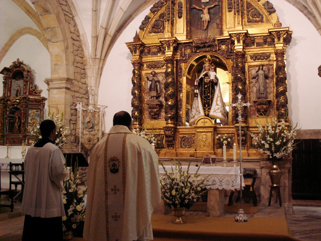 Estas primeras fotos son de la misa de 07.00 h, la primera de la mañana. Estamos cantando la Salve después de la Misa. Los oficiantes, D. Luis Carlos y D. Elías vienen todos los años desde sus parroquias para no faltar a esta fiesta. D. Luis Carlos se acerca desde Castañeda andando con un numeroso grupo de fieles que le acompañan desde una bien temprana hora. D. Elías viene desde más lejos, su parroquia de Potes y claro está lo hace en coche.