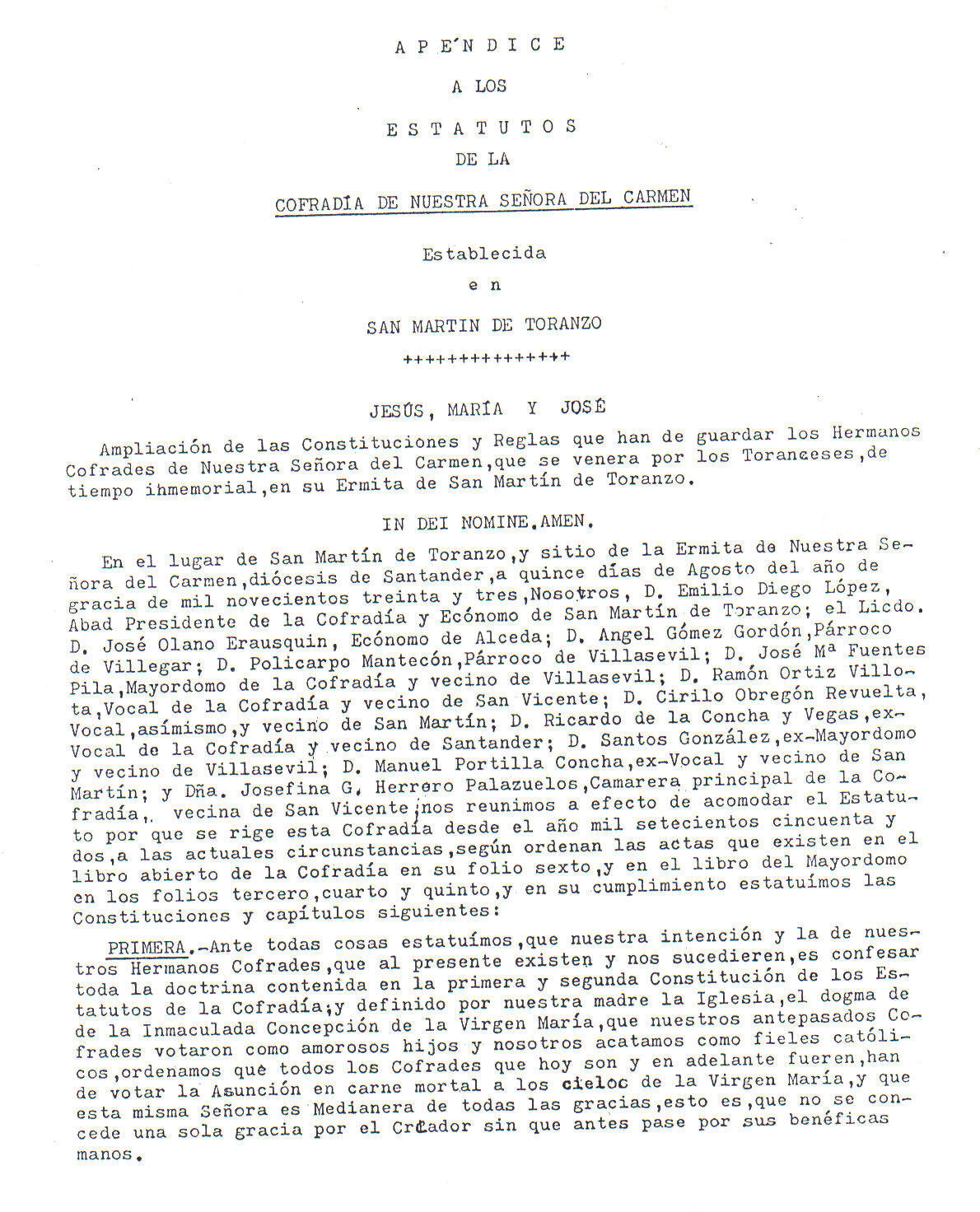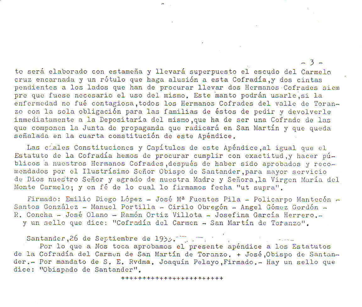 Con fecha 26 de Septiembre de 1933 el Sr. Obispo de la Diócesis de Santander aprobó un Apéndice a los Estatutos ya mencionados.