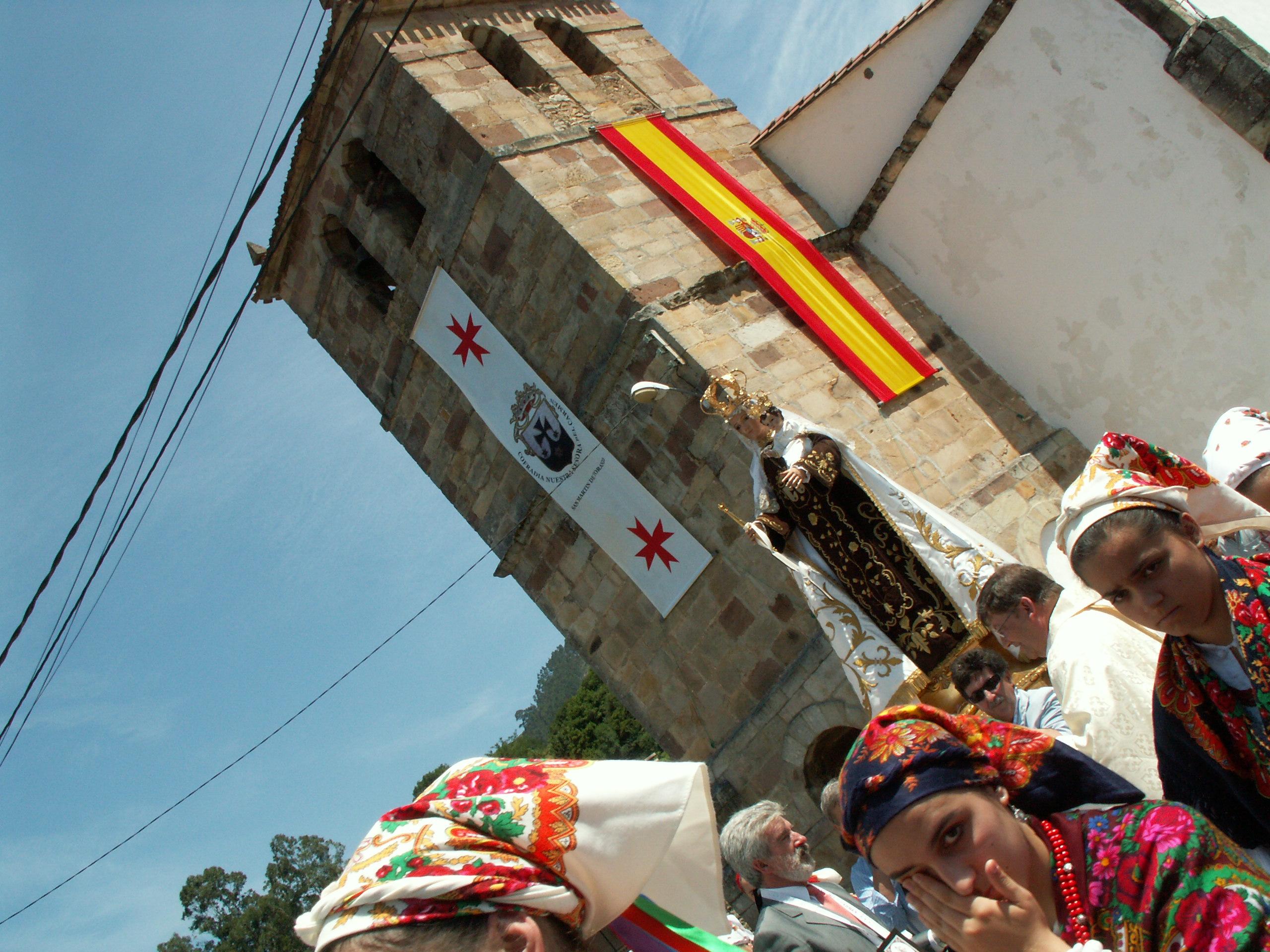 La primera parada que se realiza es frente a la Iglesia de San Martín, cuya torre se encuentra engalanada con las banderas de España y la Cofradia.