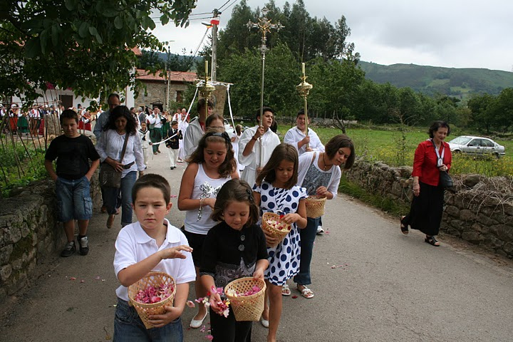 Los niños siembran el camino de pétalos de rosa para que pase Nuestra Señora.