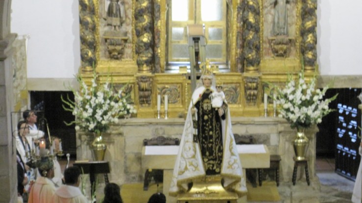 Ya dentro de la ermita, la Virgen preside mientras que nos colocamos para cantarle la Salve.