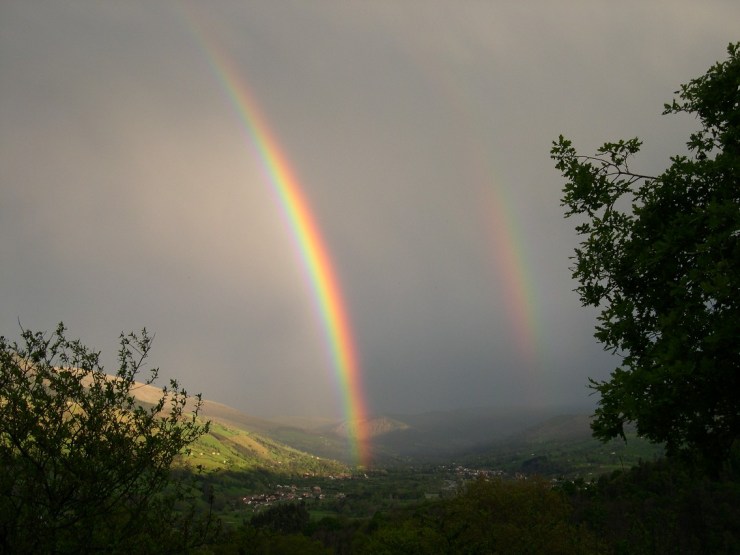Valle de Toranzo desde Salcedillo, arco iris sobre San Martín, río Pas. Abajo vista de Puente Viesgo.