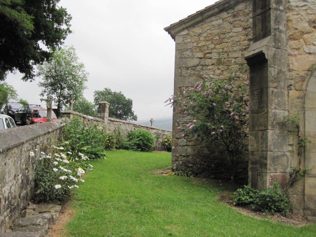 – Iglesia de Borleña, exterior de la iglesia rodeada de un bonito y cuidado jardín.
