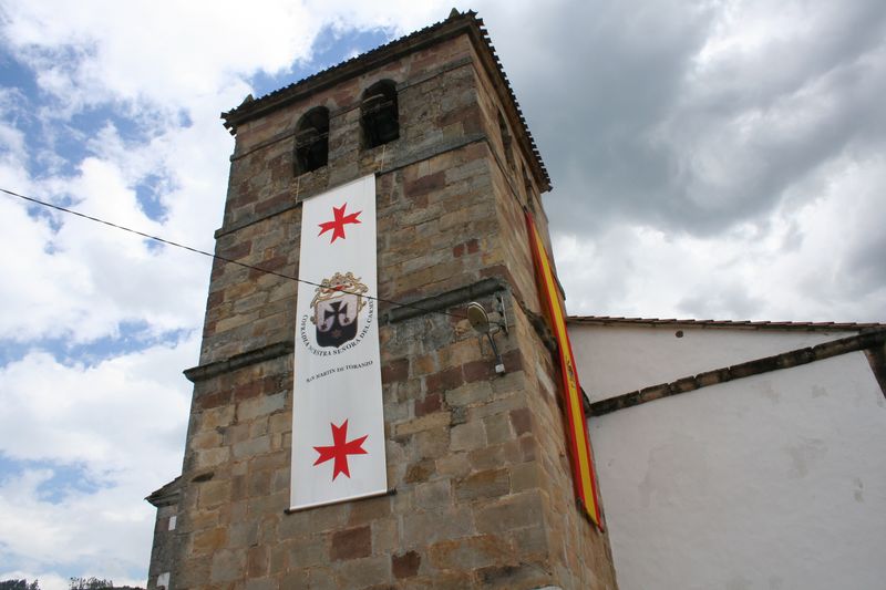 – Exterior de la iglesia parroquial de San Martín de Toranzo, torre engalanada en el Carmen.